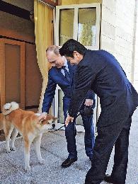 普汀週六中午在索契近郊的總統官邸宴請安倍,兩人會談約兩個半小時。普汀攜秋田犬“Yume”(日語意思為“夢”)在門口迎客。俄國傳媒報導,安倍用俄語說“狗真乖啊”,普汀則應稱“是啊,不過有時也會咬人”。Yume是秋田縣為答謝俄國在3.11地震後向日本東北提供援助而送贈的,普汀以一隻西伯利亞貓回禮。
