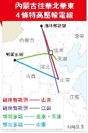 特高壓輸電就是使用1000千伏以上電壓等級輸送電能,可作大功率的中、遠距離輸電。梁鐵城稱,國家首期提出在內蒙建設4條特高壓輸電線分別是:錫林郭勒盟至山東和江蘇、鄂爾多斯至山東以及北京、天津(見圖),這4條特高壓線輸電能力可達3100萬千瓦,配套電力裝機4200萬千瓦,其中包括600萬千瓦的風電裝機,總投資約在2673億元人民幣(約3385億港元),4條線路同時啟動,規模是全國最大。