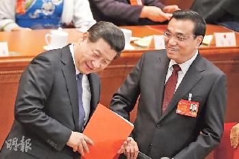 大會閉幕,一直嚴肅的習近平(左)在散會時與李克強(右)交流,展露歡顏。而李克強的政府工作報告獲高票通過,也是喜上眉梢。(圖:中國中新社)