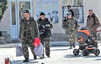 在克里米亞的貝爾貝克空軍基地,上週五有烏克蘭士兵收拾細軟離開(圖),但亦有軍人堅持留守。(圖:法新社)
