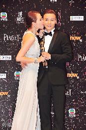 張晉憑《一代宗師》首奪“最佳男配角”,太太蔡少芬在台下喜極而泣,之後在後台獻吻祝賀。(圖:香港明報)