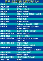 (香港)“第33屆香港電影金像獎頒獎典禮”昨日假文化中心舉行,獲最多14項提名的《一代宗師》共獲12獎成為大贏家,破了《甜蜜蜜》和《寒戰》9個獎的紀錄,分別是最佳電影、最佳導演、最佳女主角、最佳男配角、最佳攝影、最佳編劇、最佳剪接、最佳美術指導、最佳服裝造型設計、最佳動作設計、最佳原創電影音樂、最佳音響效果。大熱門章子怡憑《一》片9度封后,張家輝憑《激戰》擊敗梁朝偉封帝。