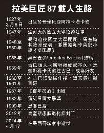 (墨西哥)被譽為西班牙語文學400年來最偉大作家、諾貝爾文學獎得主馬奎斯週四(17日)在墨西哥城家中病逝,享年87歲。馬奎斯的魔幻現實主義手法影響文壇深遠,他1967年出版的《百年孤寂》翻譯成35種語言,全球賣出5000萬本。哥倫比亞總統桑托斯稱,馬奎斯辭世帶來“千年的孤獨和悲傷”。信奉社會主義的馬奎斯一直支持拉美左翼運動,更是古巴領袖卡斯特羅好友,後者曾譽他為“拉丁美洲最有力量的人”。