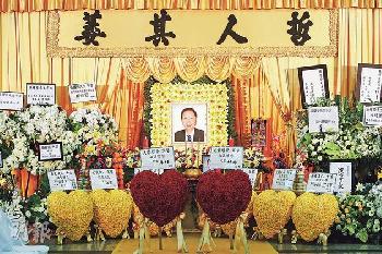 “演唱會之父”張耀榮的喪禮莊嚴,遺照臉容慈祥,前面擺放兩位太太致送的花圈。(圖:香港明報)