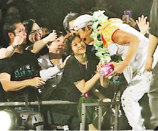 大曬麒麟臂的阿Sam向歌迷送吻,掀起高潮。(圖:香港明報)