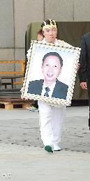 張耀榮長子張永康手持父親遺照,在紅館內繞場一週,表揚父親對本地樂壇的重大貢獻。(圖:香港明報)