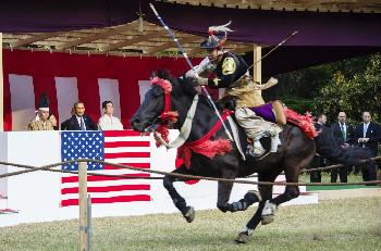 奧巴馬昨在明治神宮欣賞日本傳統騎射表演。(圖:法新社)