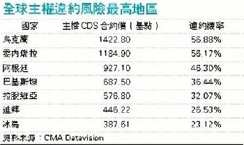 (阿拉伯‧迪拜)迪拜世界推遲償還巨債,令迪拜主權債務危機升級,數據研究機構CMA Datavision最新數據顯示,週四(11月26日)反映違約風險的迪拜主權信貸違約掉期(CDS)合約價暴升,一躍升至全球違約風險(即無力還債)第6高的地區。