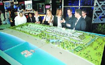 迪拜世界陷財困,棕櫚島工程能否完成仍是未知之數。圖為一班準買家早前在迪拜參觀棕櫚島的發展模型。(圖:香港明報)
