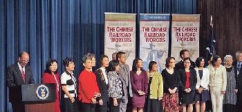 在數十名當年參與興建鐵路華工後代的見證下,美國勞工部長佩雷斯(Thomas Perez)、副部長盧沛寧與勞工後人代表虞容儀芳,前天(9日)在首都華盛頓的勞工部,共同舉行華工入選“勞工名人堂”(Labor's Hall of Honor)揭牌儀式,讓這批華工與多名美國勞工界先驅同列名人堂。