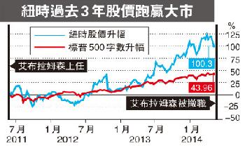 艾氏並未亮相,其預先準備的聲明中,形容自己“曾喜歡在《紐時》的時光”。在她不足3年任期內,《紐時》贏得8項普立茲獎,公司股價亦大幅跑贏大市(見圖)。在她被革走的消息傳出後,《紐時》股價隨即下跌4.4%。據報艾氏與報方簽署協議,雙方都不會公佈她被炒的內幕細節。
