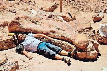 (阿根廷)阿根廷一名農民日前在中南部的沙漠,意外發現巨型恐龍化石,有的骨頭長度比人還高。考古學家經挖掘分析後,鑑定應屬於泰坦龍(titanosaur)的一個新品種,從大腿骨長度估算,從頭部到尾端長達40米,站立時高度達20米(約7層樓高),重達77噸,是歷來發現地球最大型陸上動物。