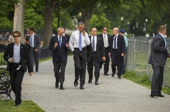 (美國)平日出入坐防彈車的美國總統奧巴馬週三忽萌興致,決定由白宮步行到幾條街外的內政部。雖然離不開特工和隨員圍繞,但他並無把巧遇的中國和以色列旅客拒之於外,跟他們打招呼、握手並閒聊幾句。