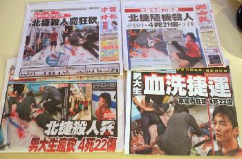 5月22日,《中國時報》、《聯合報》等多家台灣報紙頭版頭條報導一天前發生在台北捷運(地鐵)江子翠站的隨機砍人事件。(圖:中國中新社)