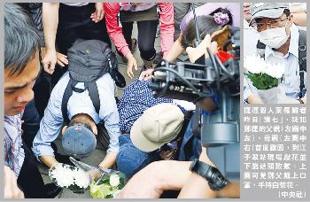 (台灣)昨日是台灣捷運血案死難者“頭七”,疑兇鄭捷父母首度現身,親往江子翠站外獻花哀悼,兩人當眾磕頭、下跪痛哭,不斷致歉,稱希望法官可以速審速決兒子,來告慰受難者家屬。但有死者家屬指不接受他們道歉,批鄭捷父母“作秀”。