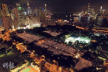 維港一隅燦爛一夜。支聯會昨在維園舉行六四25週年燭光晚會,大會稱有逾18萬人出席,參加者坐滿6個足球場(中)、鄰近的籃球場(右下),草坪(中上方)也擠得水泄不通,遲來者無法進場;警方表示高峰期有99,500人。從高處看,片片燭光之海,與維港及周圍的霓虹燈光,構成每年一度的獨有畫面。而今年另一端的尖沙嘴亦有六四集會。(圖:香港明報)
