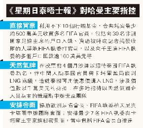 (英國)卡塔爾涉嫌透過行賄獲取2022年世界杯主辦權的醜聞持續擴散,英國傳媒昨揭露卡塔爾足壇前掌門人哈曼涉嫌牽線助卡塔爾用天然氣折扣換取泰國支持,又暗示卡塔爾與同時當選的2018年世界杯主辦國俄國進行底交易。今次醜聞令國際足協(FIFA)備受壓力,3家主要贊助商開腔要求FIFA徹查。部份FIFA高層宣稱若證實卡塔爾賄選,將支持重選。