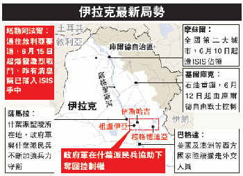 ISIS上週起佔領伊拉克北部多地,此組織透過社交網站大肆宣揚已殺害1700名軍警,惹來各方譴責。伊拉克軍隊與響應宗教領袖號召的什葉派民眾合作發動反攻,奪回數城鎮,但首都巴格達附近鎗戰不斷。軍方還嘗試阻止ISIS控制通往敘利亞要道的北部城市塔勒阿法爾,但當地居民昨向法新社透露,ISIS已擊潰政府軍,攻佔大部份地區,不少居於當地的什葉派土庫曼人舉家逃難。