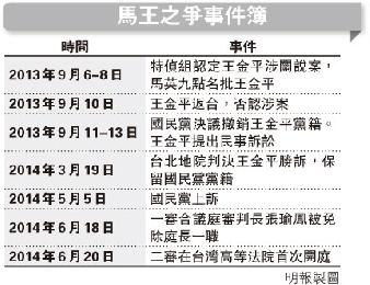 去年總統馬英九與王金平去年9月爆出“馬王之爭”後,國民黨決議免去王金平黨籍。王金平提出民事訴訟並在今年3月勝訴,國民黨提出上訴。二審昨日在台灣高級法院開審。(香港明報)
