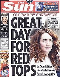 但梅鐸旗下《太陽報》及《泰晤士報》卻重點報導身為梅鐸“契女”的布魯克斯無罪,高呼勝利,又斥其他人藉竊聽“抹黑”。布魯克斯曾任職的《太陽報》昨在頭版大字標題“紅色的大日子”(Great Day for Red Tops),“紅色”既指布魯克斯的紅髮,也指小報。此報社評更聲言布魯克斯等5人脫罪是“英國司法的勝利”,但對庫爾森及《世界新聞報》已有記者罪成的事實避而不談,反指其他人藉竊聽指控“抹黑”小報。此報副編輯更撰文,嘲諷一直對小報文化窮追猛打的《衛報》、《獨立報》及BBC,揚言它們“今天一定在哀悼”,聲言:“謝天謝地,我們邁出回歸真正新聞自由的一步。”