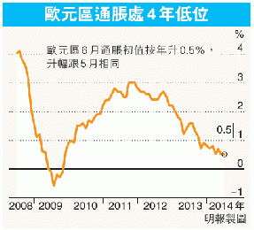 上月的0.5%通脹是2009年11月以來的低位,雖然4月通脹曾升至0.7%,卻是受復活假期因素影響。歐央行預期,目前的低通脹水平仍會維持多月。不過撇除波動較大的食物及能源價格,6月核心通脹按年升0.8%,較之前一個月微升0.1個百分點。在低通脹下,實際還款開支居高不下,令政府、家庭及企業較難減輕債務,情况以負債嚴重的南歐尤甚。家庭及企業預期未來價格再跌,亦會押後消費及投資。