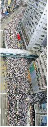 數以十萬計市民昨參加大遊行,明報記者於昨午4時15分從銅鑼灣一大廈(圖),以及晚上7時15分在灣仔一大廈(圖2)向東拍攝,不論日間還是入夜,遊行人龍連綿不斷,擠滿銅鑼灣軒尼詩道3條行車線和2條電車線。(圖:香港明報)