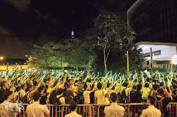 七一遊行完結後,數以百計人士響應學民思潮號召包圍特首辦,高舉熒光棒,象徵要求政府對政改開綠燈。(圖:香港明報)