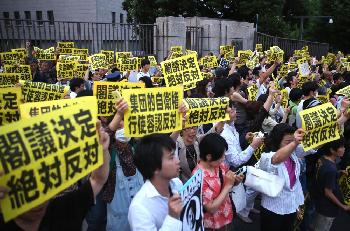 數以千計反對解禁集體自衛權的民眾週一起在首相官邸示威,高呼“不要戰爭”、“反對破壞和平憲法”等口號。有示威者稱,決議案以保護國民為名,卻反使國民更易陷入戰爭,可能給後代埋下禍根。有民眾怒斥,若要解禁集體自衛權,應正式進行修憲公投,釋憲“不是法治國家應有做法”,擔心未來政權可能不斷藉詞修憲,亦憂慮日本或在戰爭中被美國隨意利用。