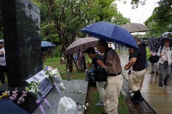 近百名日本長崎市民前日冒雨聚集到“中國人原子彈爆炸犧牲者追悼碑”前,舉行“七七事變”紀念活動,追悼69年前遭長崎原子彈炸死的中國勞工。(圖:中國中新社)