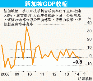 (新加坡)新加坡第二季GDP按季折合成長率出乎意料收縮0.8%,跟市場預估的2.4%增長相距甚遠,首季GDP則修訂為增長1.6%。彭博社指出,由於勞動力緊張,勞工成本上漲,促使企業將生產轉移海外,令製造業第二季產出急跌19.4%。《華爾街日報》稱,新加坡經濟短期內將受到向高增值產業轉型的障礙所累。
