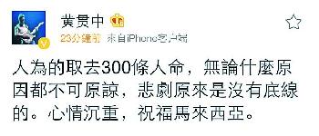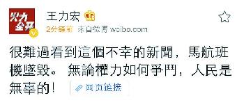 王力宏看到這宗不幸的新聞很難過,他慨嘆:“馬航班機墜,無論權力如何爭鬥,人民是無辜的!”黃貫中沉重說:“人為的取去300條人命,無論什麼原因都不可原諒,悲劇原來是沒有底線的,心情沉重,祝福馬來西亞。”胡兵建議大家少去危險地帶:“出行前查一查航路圖……譴責一切恐怖行動!”