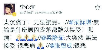馬來西亞航空客機MH17前日由荷蘭阿姆斯特丹飛往馬來西亞吉隆坡途中,在烏克蘭東部疑被導彈擊落墜,機上298名乘客及機組人員(包括未在名單上的3名嬰孩)全數罹難。悲劇發生,震驚全球。娛樂圈藝人紛紛在微博留言悼念,悲嘆乘客及機組人員無辜喪命。馬來西亞藝人李心潔說:“太沉痛了!”黃貫中斥道:“人為取去人命不可原諒!”王力宏亦難過說:“無論權力如何爭鬥,人民是無辜的!”