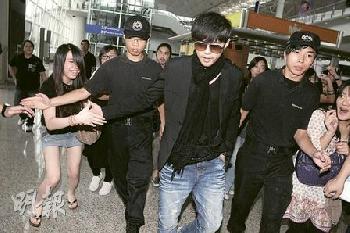 (香港)周傑倫與浪花兄弟週五(6月18日)下午抵港,晚上出席《熊貓人》記者會。周董出關時戴上墨鏡,樣子極Cool,20多名接機的女粉絲群起而上,爭取機會拍照及送禮物,周董亦沒有抗拒,一邊走一邊接過禮物。其間,有粉絲跌倒,周董即時出手拉著。