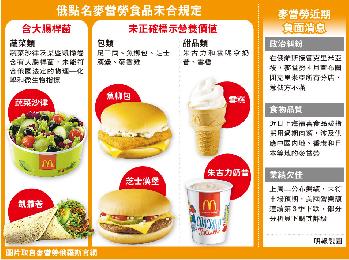 (美國)美俄關係因烏克蘭問題持續緊張之時,俄羅斯一個官方消費者安全監管機構入稟法院,指控美資麥當勞快餐店違反多項食品衛生要求和健康標籤規例,包括食物含菌和營養標籤與事實不符,要求禁止該快餐連鎖店發售足三、魚柳包、麥香雞、沙律和奶昔等暢銷產品,《金融時報》指俄國此舉如同“反擊西方”。