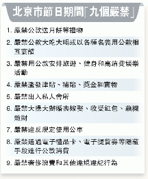 (中國)在中秋節、國慶即將來臨之際,北京市紀委前日發佈了《關於嚴明紀律堅決防止公款送月餅節禮等不正之風的通知》,提出了嚴禁公款送月餅等禮物、嚴禁公款大吃大喝等“九個嚴禁”,並表示將對典型案例點名道姓予以通報曝光。