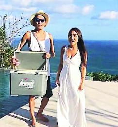 (印尼)身在峇里的梁家輝陪女兒行善,就連已有8個月身孕的楊張新悅亦都挑戰冰水做善事,用胎教教腹中寶寶都一齊行善。身在峇里的梁家輝陪女兒Nikkie行善,家輝拿著巨型旅行冰箱,向女兒Nikkie淋冰水絕不手軟,女兒在陽光沙灘美景下淋濕後,就索性去游水了。