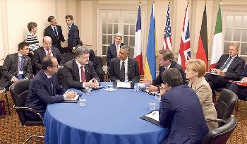 烏克蘭總統波羅申科(左二)昨日在北約峰會上與法國總統奧朗德(左一)、美國總統奧巴馬(左三)、英國首相卡梅倫(右三)、德國總理默克爾(右二)及意大利總理倫齊(右一背對鏡頭者)等歐美領袖會面,商討烏克蘭問題。(圖:法新社)