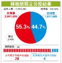 今次公投有逾400萬選民登記,投票率高達84.6%,為英國歷來投票率最高的選舉。儘管選前數週民調顯示獨立派支持度急增,至昨日開票初期,獨立派亦一度領先,惟其後獨立派在首府愛丁堡以六四之比敗陣,其餘絕大部份選區亦宣告失利。蘇格蘭最大城市格拉斯哥,則是獨立派勝出的4個選區之一。最終點票結果,贊成獨立票約162萬票(44.7%),較反對獨立的200萬票(55.3%)少逾10個百分點,差距比之前估計為多。