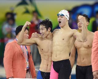 之後,孫楊與余賀新、林永慶、寧澤濤合作,一舉奪得男子4100米自由泳接力金牌並打破亞洲紀錄,日本、韓國分獲銀銅牌。