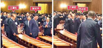 據新華社報導,江澤民等退休領導人排名顯然在現任政治局委員之後,不過,標題卻將江標在7名政治局常委之後;現場圖片更顯示,江是緊隨習近平之後第二個入場的,且身後只有中央警衛局前任局長由喜貴(江的隨身護衛,退休後仍跟江出入)和現任局長曹清,並未見任何現任或前任領導人。散場時江更先習一步,首先離開,習緊隨其後,之後才見李克強。(香港明報)