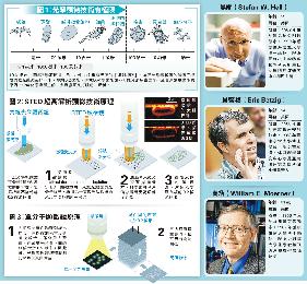 黑爾於2000年開發出“受激發射損耗(STED)顯微鏡”(圖2)。他用一束激光激發熒光份子發光,再用另一束激光消除掉納米尺寸以外的所有熒光,通過兩束激光交替掃描樣本,呈現出“納米級”圖像。