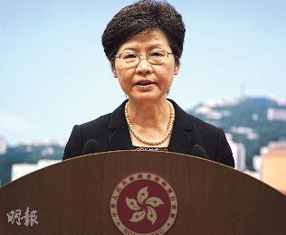 隨著學聯等宣佈連串不合作運動及號召市民上街,政務司長林鄭月娥(圖)決定暫時擱置原定今午與學聯代表的對話,並稱感到無奈和失望。(圖:香港明報)