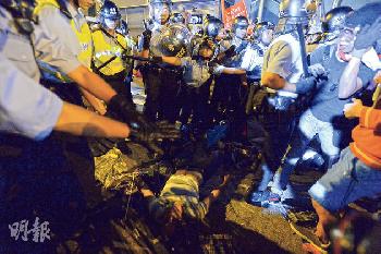警員和示威者在衝突中不斷推撞,有示威者在混亂中倒地,有警員即時撥開同袍,以免人踩人。(圖:香港明報)