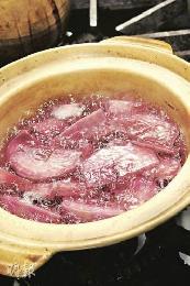 步驟1:紅菜頭去皮切片,加入一斤半水,煮20分鐘,待顏色滲出。(圖:香港明報)