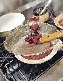 步驟4:以筲箕隔渣,把紅菜頭汁加入醋中,分量隨意,以配合個人口味及顏色漂亮為主。略煮,隔渣取汁即成。(圖:香港明報)