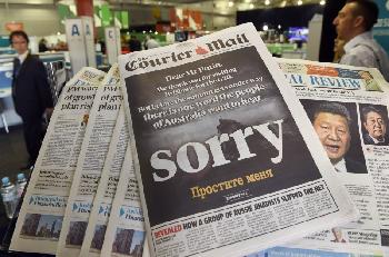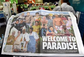 布里斯班報章Courier-Mail昨在頭版刑登跨頁改圖(圖),以調侃方式歡迎出席G20峰會的各國領袖,圖中可見美國總統奧巴馬袒胸露腹,德國總理默克爾抱著樹熊,中國國家主席習近平肩披毛巾,像是要去游泳,主持峰會的澳洲總理則剛從水中冒出來,只穿三角緊身泳褲。版面標題為“歡迎來到天堂”,語氣輕鬆,不過內頁則大字標題要求俄羅斯總統普汀為馬航MH17客機被擊毁道歉。(圖:法新社)