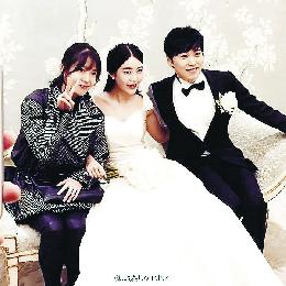 晟敏成為Super Junior首名成家立室的成員,昨日迎娶音樂劇女演員金思恩,BoA亦有觀禮,並與一對新人合照。(微博圖片)