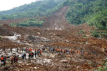 數百名救援人士用徒手及用鐵鏟在泥土與房屋廢墟中尋找失蹤者。當局調派大型挖掘機器參與搶救,但昨午災區再下大雨,恐再次引發山泥傾瀉,挖掘行動被迫停止。交通及通訊受阻亦令救災難度增加。