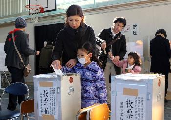 日本昨日舉行大選,但選民投票意欲不高,投票率創下二戰後新低。圖為一名女選民帶著女兒身教投票過程。(圖:法新社)