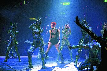 Sammi爆炸頭性感造型與赤裸上身,穿幼邊褲的男舞蹈員勁歌熱舞。(圖:香港明報)